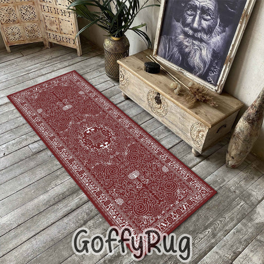 Burgundy and White Boho Chic Medallion Runner Rugs Ethnic Carpet Non-Slip Washable Bohemian Mat for Living Room Bedroom Kitchen Decor