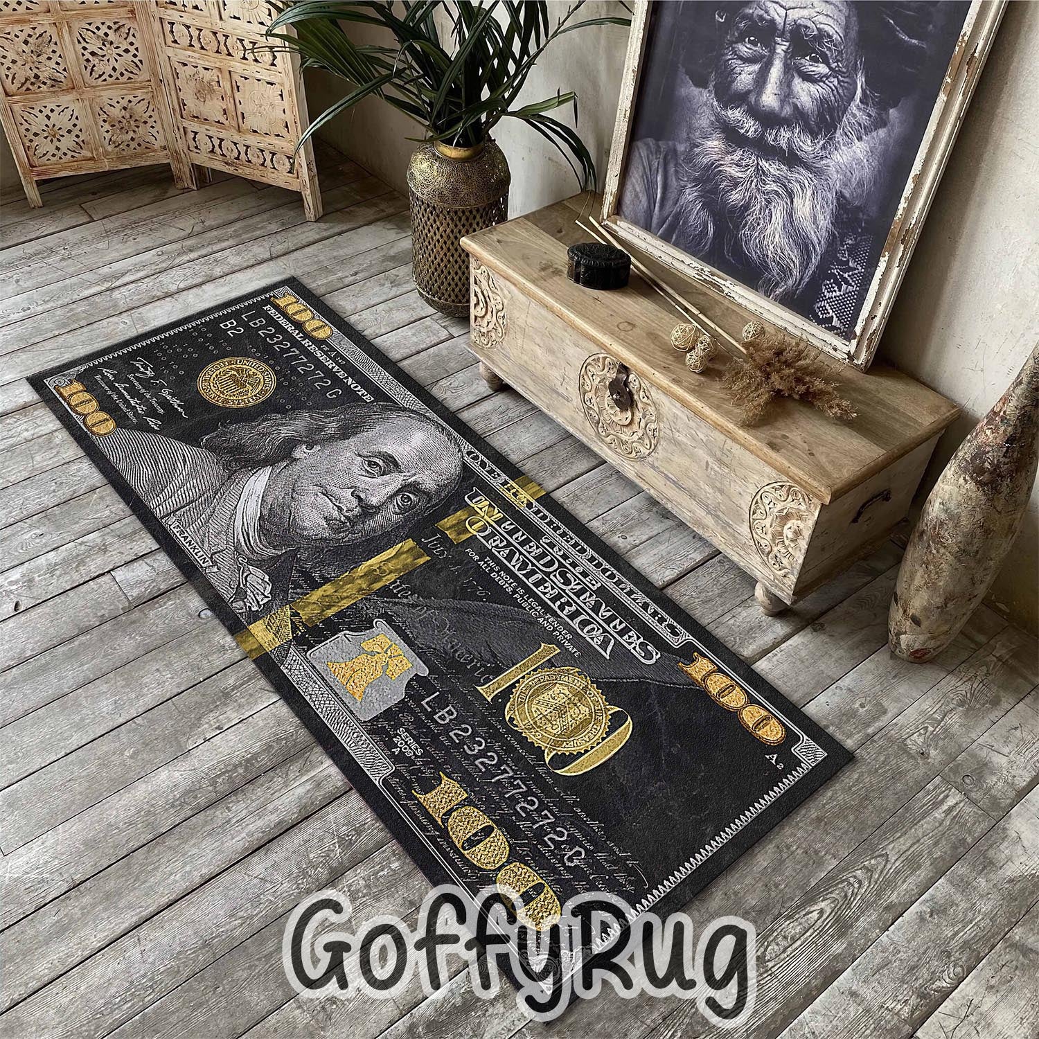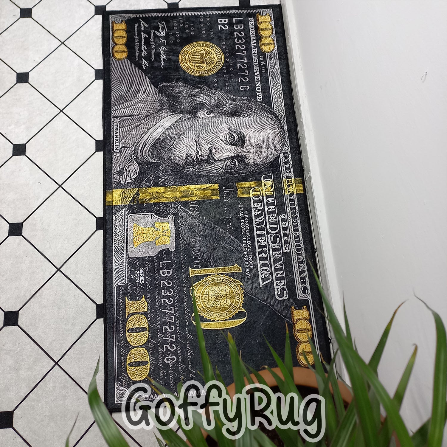 Black and Gold 100 Dollar Bill Runner Rug Benjamin Franklin Patterned Carpet for Kitchen Hallway Bedroom Living Room Luxury Home Office Decor